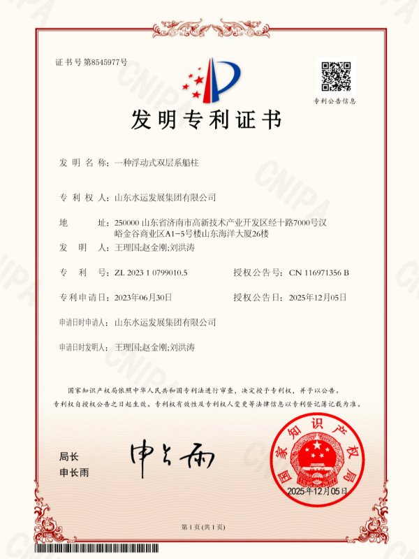 近日,山东海洋集团水运枣庄分公司申报的“一种浮动式双层系船柱”发明专利获得国家知识产权局授权,取得发明专利证书。